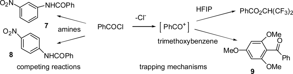 - Song, BD; Jencks, WP. Mechanisms of solvolysis of substituted benzoyl halides. J. Am. Chem. Soc 1989, 111, 8470–8479. [Google Scholar]