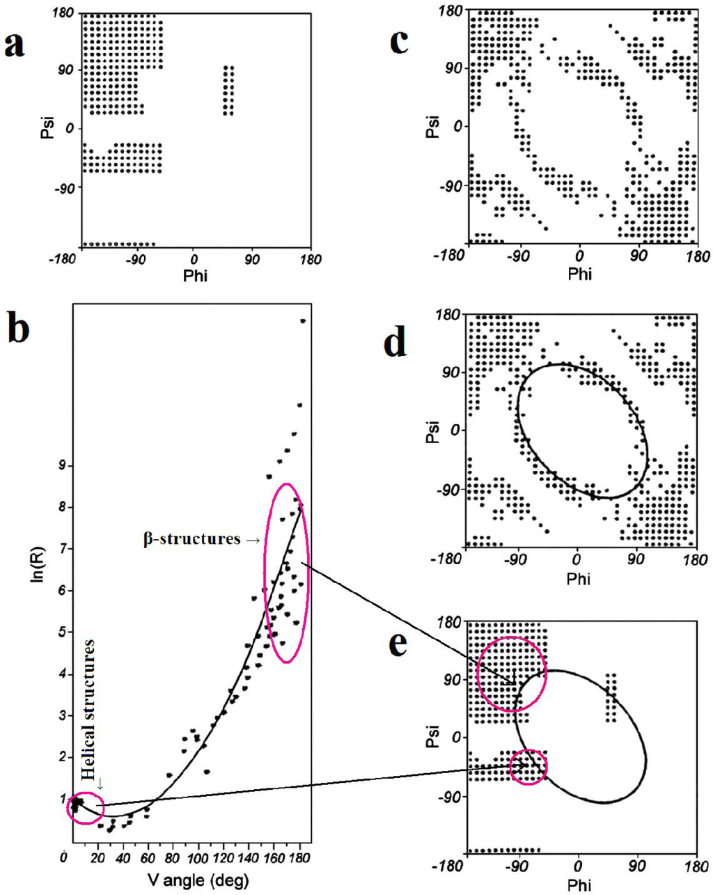 The ES model definition. (a) the Ramachandran plot with its low-energy area distinguished; (b) the relation between the V-angle (dihedral angle between two sequential peptide bond planes) and R-radius of curvature (using a logarithmic scale to avoid large values for β-structural forms), calculated for structures corresponding to low-energy areas on the Ramachandran plot (shown in a), together with the approximation function (2nd degree polynomial); (c) the Ramachandran plot with points representing structures accordant with the approximation function shown in (b); (d) the elliptical path assumed to represent the limited conformational subspace for the early-stage intermediate; (e) the elliptical path encompassing all secondary structures. The areas distinguished in (b) (small values of V for helical structures and large values for β-like structures) and their placement on the Ramachandran plot (e). The arrows linking b and e show the helical and β-like structures in two representations: V/R parameters (b) and Ramachandran map (e).