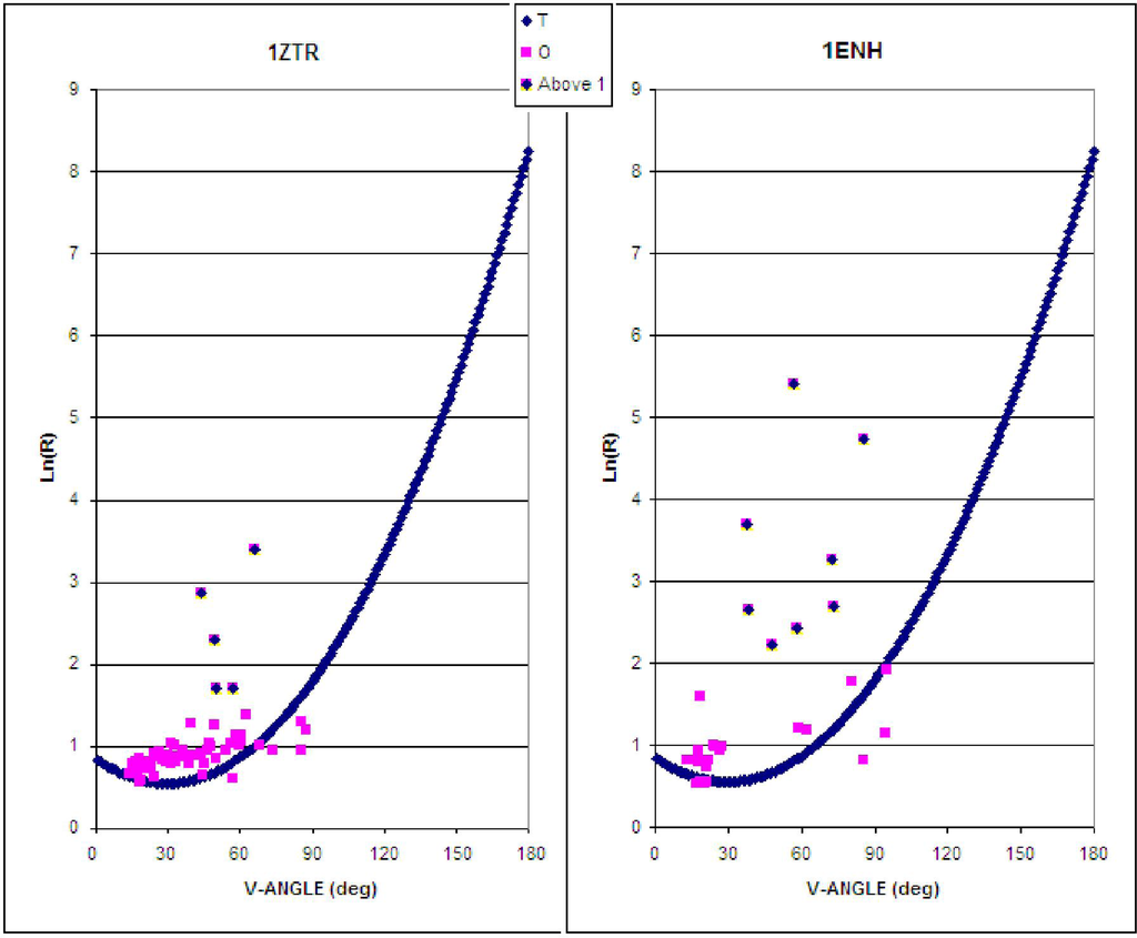 Residues exhibiting significant discrepancies between actual and predicted positions (ln(R), dependent on the V-angle) are located in close proximity to PRO (4) and GLY (39) (PDBSum indices for 1ZTR) in both proteins. The positional irregularity of these residues and their neighbors is probably due to their high structural specificity. PRO is the most rigid residue (φ angle fixed) while GLY is the most flexible residue among the 20 amino acids.