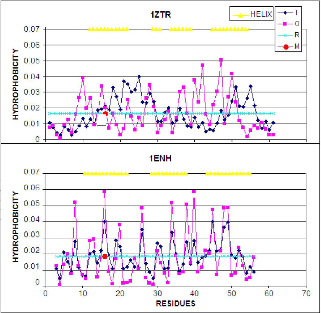 LS model. Top: the hydrophobicity profile plotted along the polypeptide chain in 1ZTR; bottom: the corresponding profile in 1ENH (LS). Dark rhombuses–theoretical distribution; pink squares–observed distribution; light blue line–random distribution. The red circle marks the point of mutation. T, O and R denote the theoretical, observed and random distributions, respectively. The yellow triangles distinguish the helical fragments.