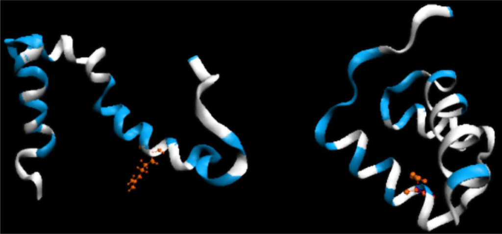 3D structure (ribbon) of 1ZTR (left) and 1ENH (right), with residues represented by dark distributed points in Figure 2. The red fragments represent polypeptides whose positions differ from expectations. The white fragments represent the position of point mutation L16A in ES form (left picture).