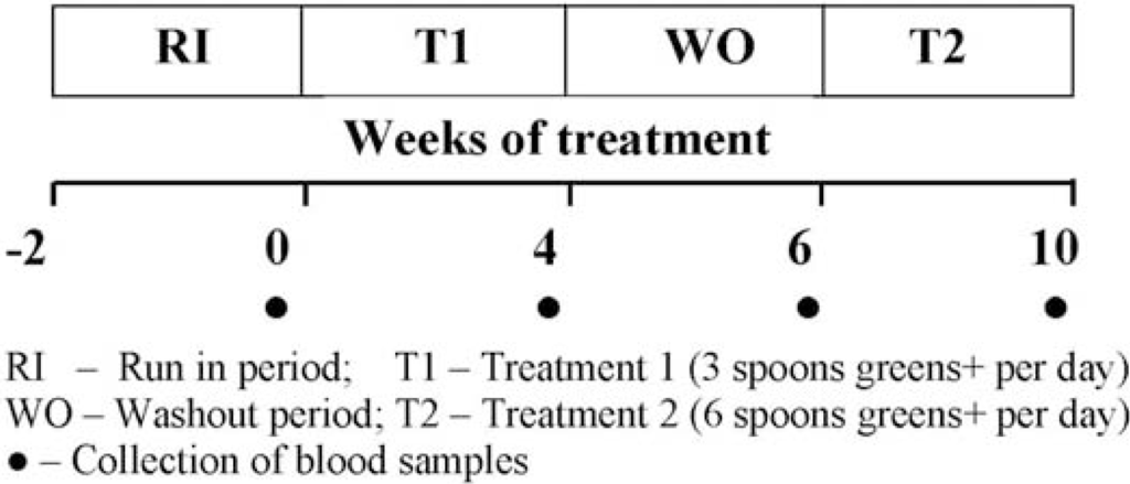 - Bloom, H. Effect of greens+: A randomized, controlled trial. Can. J. Diet Pract. Res 2004, 65, 66–71. [Google Scholar]