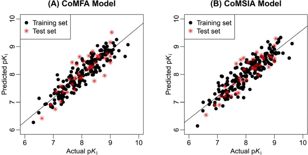 The correlation plots of the predicted versus the actual pKi values using the training set (black dot) and the test set (red asterisk) based on the (A) CoMFA and (B) CoMSIA of ligand-based model.