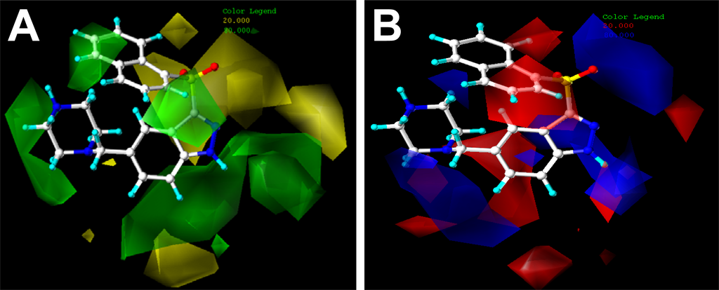 The steric and electrostatic fields from the best CoMFA model are represented in Figure 2. In the steric field (Figure 2A), the green colored contours represents regions of favorable steric effect, while yellow colored contours represent regions of unfavorable steric effect, respectively.