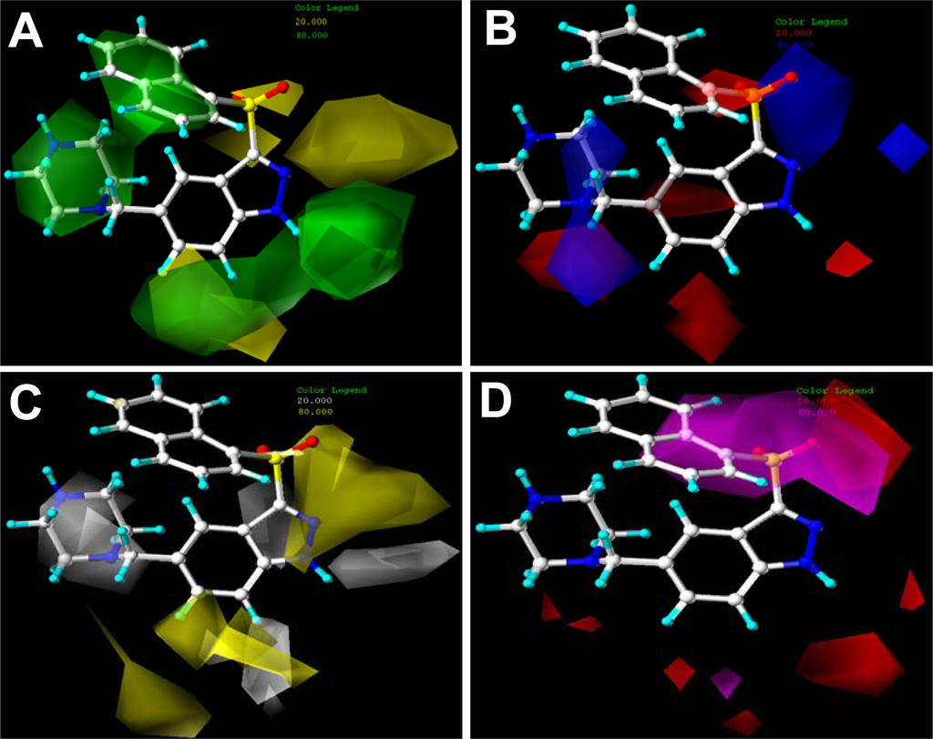Figure 3D depicts the H-bond acceptor contour map of the CoMSIA model. Magenta contours encompass areas where an H-bond acceptor will lead to improved biological activity, while an acceptor located near the red regions will result in the loss of biological activity. In this dataset, it can be easily found that a large magenta-colored map is surrounding the –SO2 group, which indicates that the presence of H-bond acceptor groups in this region will enhance the affinity. Many compounds of this class show high activity is just due to the –SO2 group they possess linked to the indazole at the 3-position as H-bond acceptors. There also exist red-colored maps near the –NH group on the indazole indicating H-bond acceptors in the zone are not beneficial to increase the activity. Thus this information obtained from the CoMFA and CoMSIA contour maps are helpful for us to understand the hypothetical interaction features of the 5-HT6 ligands.