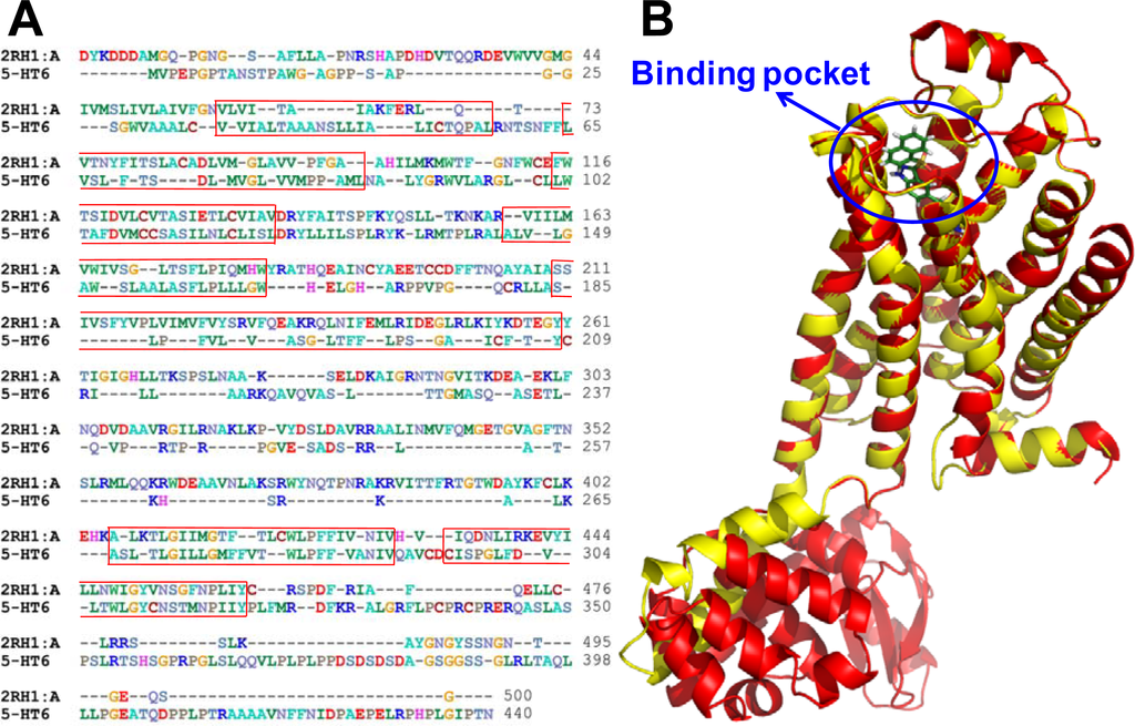Homology modeling results. (A) Sequence alignment of 2RH1 (Chain A) and the 5-HT6 receptor model, where the important transmembrane domains (TM1-TM7) are marked in red frame; (B) Superposition of the template protein 2RH1 chain A (red ribbon) and the 5-HT6 receptor model structure (yellow ribbon) from homology modeling. Compound 198 with bottle-green stick is binding into the pocket.