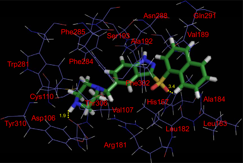 The binding result of compound 198 with 5-HT6. The ligand are colored in bottle-green and key amino acid residues in red labels around compound 198 within 4 Å. H-bonds are shown in yellow dash lines.