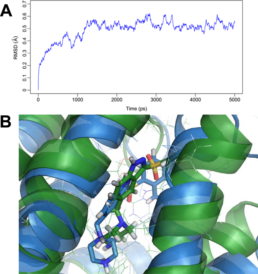 MD results. (A) RMSD of the docked complex versus MD simulation time in the MD-simulated structure; (B) Superimposition of backbone atoms in the average structure of MD simulations (light-blue) and the initial docking structure (bottle-green) for compound 198-5-HT6 complex. Herein, Compound 198 is represented as carbon-chain in bottle-green for the docking complex and light-blue for the average complex, respectively.