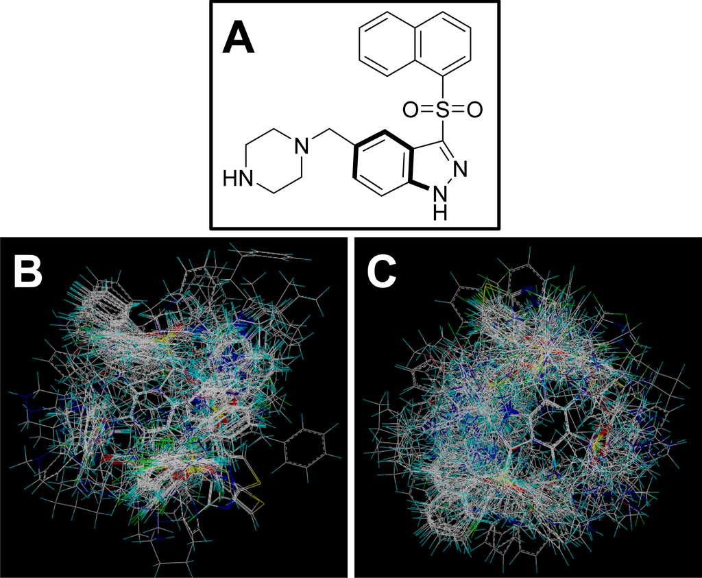 Alignment of all molecules in the dataset. (A) Compound 198 is used as the template. The common substructure (shown in bold) for the alignment of all molecules; (B) Ligand-based; and (C) receptor-based alignment of all the compounds.