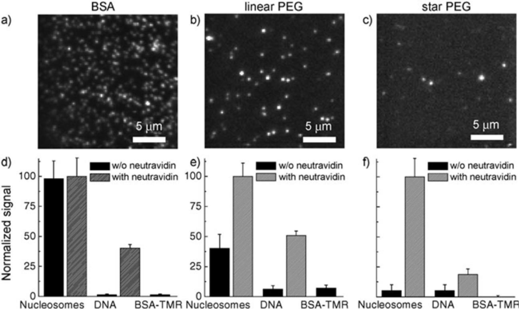 - Heyes, CD; Groll, J; Moller, M; Nienhaus, GU. Synthesis, patterning and applications of star-shaped poly(ethylene glycol) biofunctionalized surfaces. Mol. Biosyst 2007, 3, 419–430. [Google Scholar]