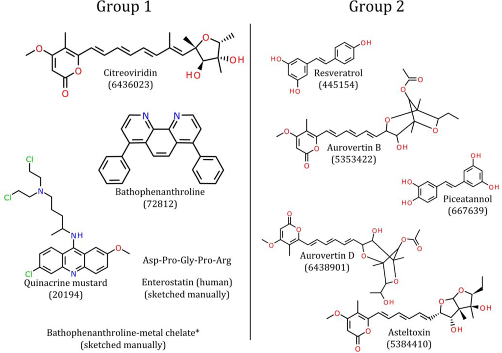 Data pertaining to known ligands of the ATP synthase beta subunit were retrieved from the PubChem [63] database by querying with their names found on the literature [64], with the exception of the peptide enterostatin and bathophenanthroline-metal chelates (see Figure 1). These two molecules were sketched manually and checked carefully using the Discovery Studio package. The ligands were separated into two groups, Group 1 (G1) and Group 2 (G2), according to their binding site location as described in the literature [64]. The compounds of G2 are known to bind to the same site on the ATP synthase beta subunit, whereas the G1 molecules are known to bind to the ATP synthase beta subunit, although the precise location of their binding site(s) was not clear: molecules in this group may bind to different location of ATP synthase beta subunit. Because reliable activity data for some molecules could not be obtained, we decided to generate a common feature pharmacophore model instead of a 3-D QSAR pharmacophore model.