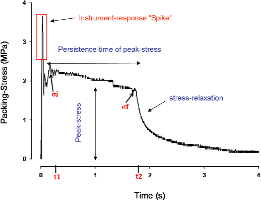 142.44 mm3 of composite material was placed in the cavity using a flat end plastic hand instrument, a glass slab used to level the material with the mould’s surface. The plunger flat end was placed lightly on the surface of the composite material to be investigated, following the first test, composite material repacked into the mould, adding material also done as required, plunger head cleaned and test repeated six times (n = 6) for each material. A representative recording of stress is shown in Figure 1: upon application of the plunger, an initial “spike” in stress is recorded: the “persistence time of peak stress” [tp] was taken as the time after the initial spike [t1] to the time of dissipation of recorded stress [t2]. The ‘mean packing stress’ [σ] was taken as the average of the stress recorded at t1 [σi] and t2 [σf]. The viscosity [µ] was calculated (Equation 1) as the mean packing stress multiplied by the persistence time of peak stress, thus: