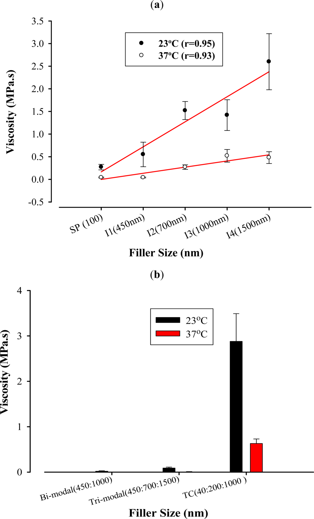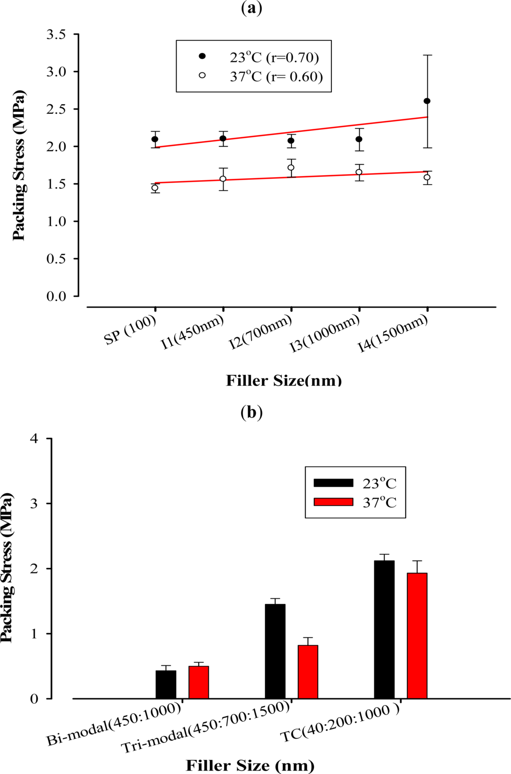 Generally, as the fillers increased in size, packing stress and viscosity increased at both temperatures. Positive correlation was evident as shown in Figures 2(a) and 3(a). However, this increase was not statistically significant among some filler sizes (P > 0.05).