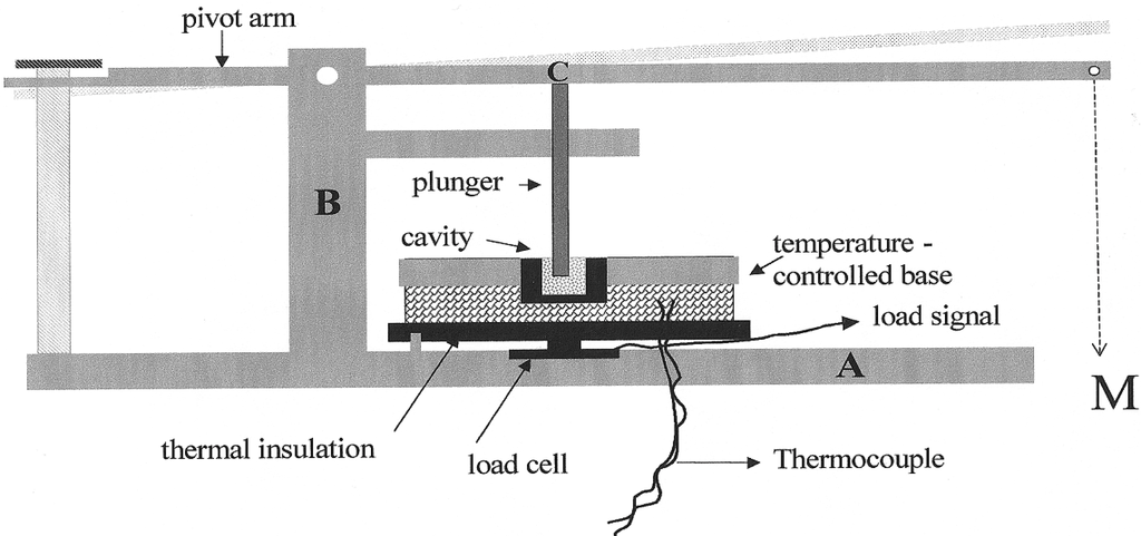 The control of penetration depth was achieved by a stop plate mounted on an additional pillar. A reduced friction bearing C was also vertically positioned to limit any angular motion of the lever produced a linear displacement of the rod. The test samples were placed in a movable cavity within the temperature controlled base D. A calibrated thermocouple tip inserted into a hole drilled into the rim of temperature controlled base monitoring the temperature of the cavity, when connected to electrical supply. The free end of the lever was weighted by a 500 g mass M.