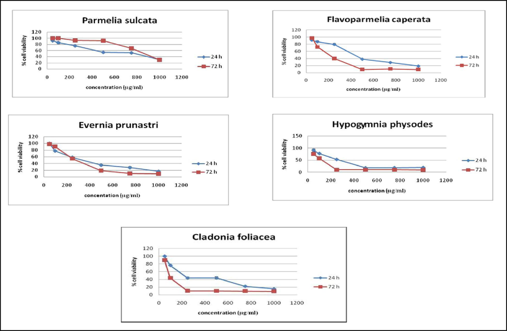 Evernia prunastri manifested cell viability reduction in a dose-dependent manner. For a longer time of treatment (72 h), a higher cell sensitivity is observed, except with lower concentrations of extract (