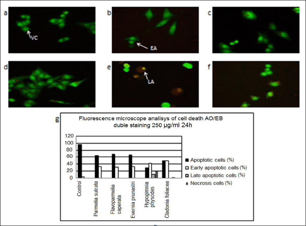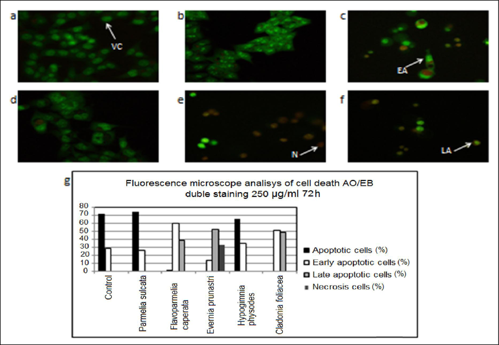 The ability of the lichen extracts to induce apoptosis was screened by the acridine orange/ethidium bromide staining. According to the fluorescence emission and the morphological aspect of chromatin condensation in stained nuclei, four types of cells could be distinguished [