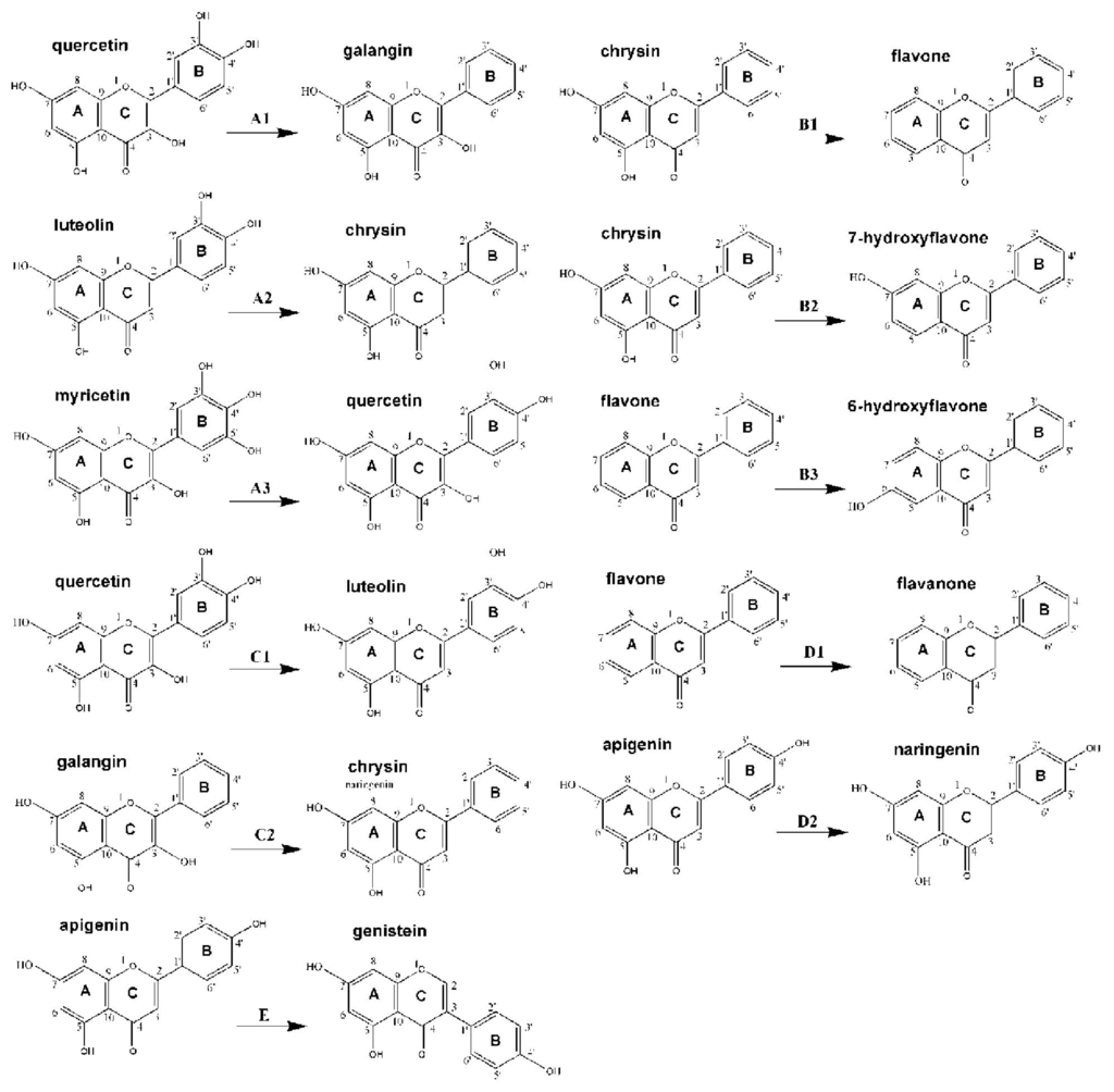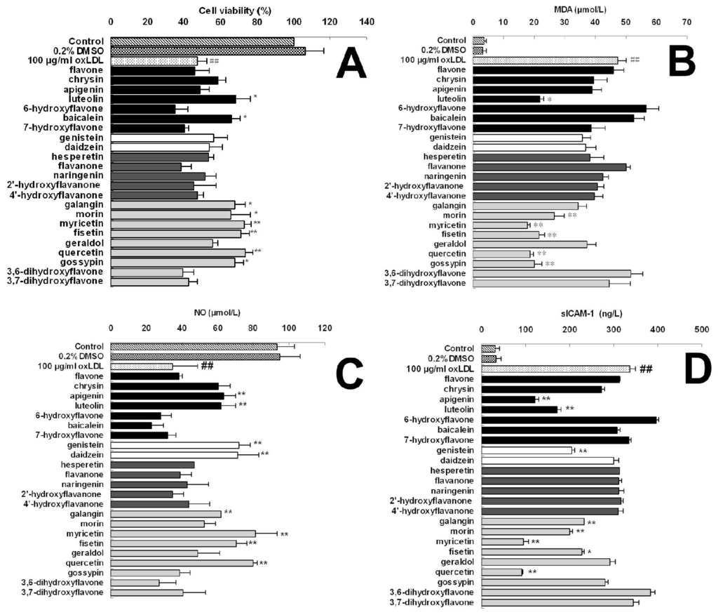 Dulbecco’s modified Eagle’s medium (DMEM) and fetal bovine serum (FBS) were both purchased from Gibco Company (Gibco, NY, USA). Cell Counting Kit (CCK-8) was purchased from Dojindo Laboratories (Kumamoto, Japan). MDA and NO assay kits were both purchased from Nanjing Jiancheng Bioengineering Institute (Nanjing, China). A total of 23 4-oxo-flavonoids (Table 1), Enzyme-linked immunosorbent assay (ELISA) kit for sICAM-1 was obtained from Sigma-Aldrich (St. Louis, MO, USA). Flavonoids were dissolved in dimethyl sulfoxide (DMSO), with the final culture concentration of DMSO ≤ 0.2%.