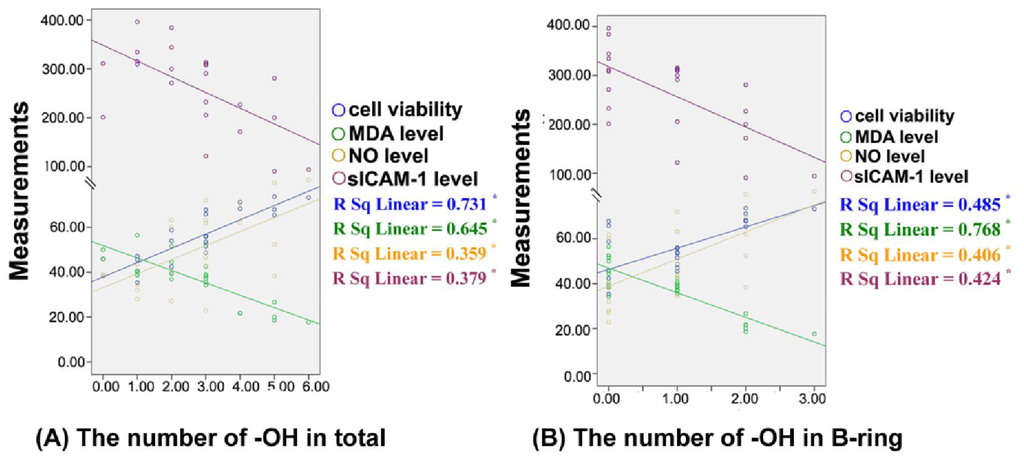 We performed the correlation analysis and paired comparison to elucidate the structure–activity relationship of 4-oxo-flavonoids in inhibiting endothelial dysfunction. Figure 3 shows that the number of −OH groups of the tested 4-oxo-flavonoids in total (Figure 3A) and in B-ring (Figure 3B) ranged from 0–6 and 0–3, respectively. Using Pearson’s Correlation Analysis, we found a significant correlation between the number of −OH moities in total and the effect of 4-oxo-flavonoids (at 40 μM) on cell viability (correlation coefficient square (R2 = 0.731, P <0.01), MDA level (R2 = 0.645, P < 0.01), NO level (R2 = 0.359, P < 0.01) and sICAM-1 level (R2 = 0.379, P < 0.01). Moreover, significant linear relationships were also observed between the number of −OH moieties in B-ring and the effect of 4-oxo-flavonoids on cell viability (R2 = 0.485, P < 0.01) and the level of MDA (R2 = 0.768, P < 0.01), NO (R2 = 0.406, P < 0.01) and sICAM-1 (R2 = 0.424, P < 0.01), respectively. The results suggested that the inhibitory effects of 4-oxo-flavonoids on the oxLDL-induced endothelial dysfunction were enhanced with the increase of −OH moieties in total or in B-ring, respectively.