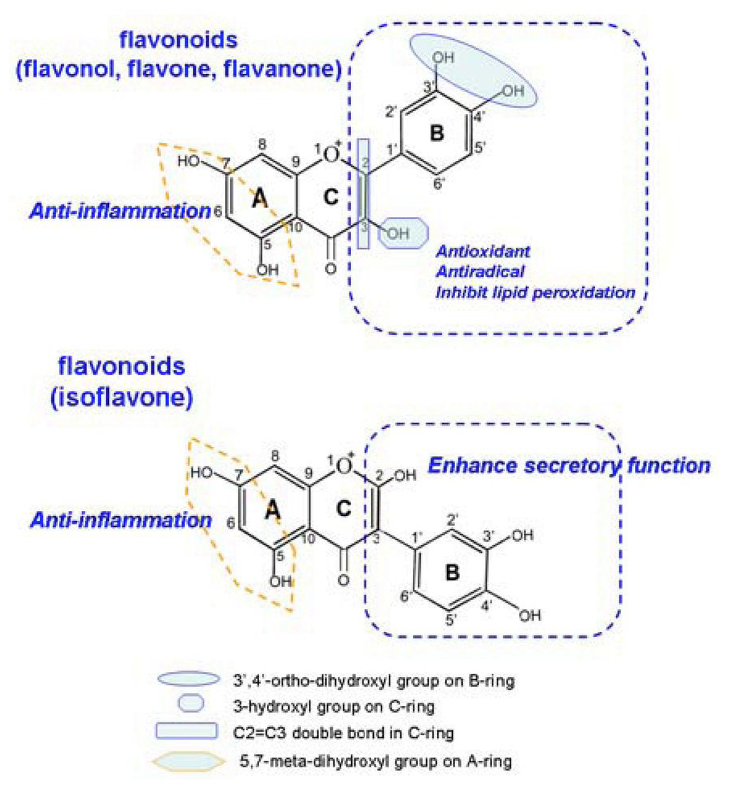 Thus, we demonstrated that flavonols were prone to improve cell viability and inhibit lipid peroxidation induced by oxidative stress in endothelial cells correlated with the presence of a 3′,4′-ortho-dihydroxyl, a 3-hydroxyl and 2,3-double bond. While flavones with a 5,7-meta-dihydroxyl and isoflavones with a B-ring on C3 position were effectual to affect the inflammatory reaction and the secretory function in endothelial cells, respectively. Flavanone, without any typical characteristics above, showed no dominant effect. Furthermore, flavonoids such as myricetin, quercetin, genistein, daidzein, apigenin and luteolin were found with significant activity in inhibiting endothelial dysfunction.