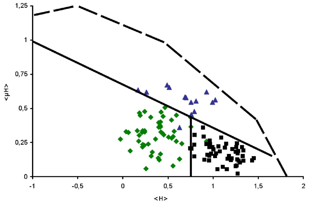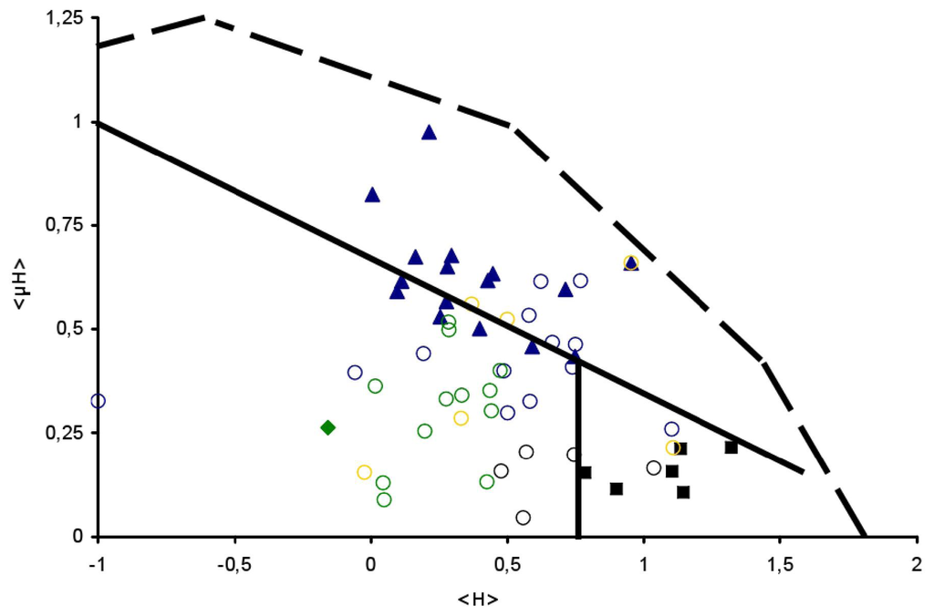 In the original Eisenberg plot methodology two features were extracted. First of all, a surface seeking propensity for surface helices are thought to exist for points close to the line <μH> = 0.600 – 0.342 <H>. Secondly, potential transmembrane helices are assumed if the mean hydrophobicity <H> is greater than 0.51 and the mean hydrophobic moment is below the line as defined above [2]. The corresponding features in the plot obtained by Heliquest generated data are <μH> = 0.654 – 0.324<H> and <H> above 0.75 respectively.