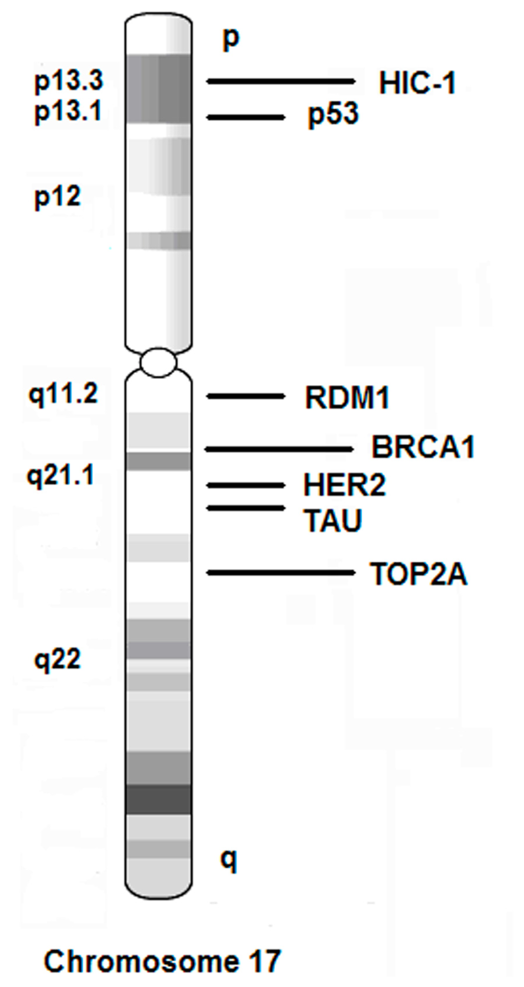 In chromosome 17, several important genes are associated with breast cancer, including oncogenic genes HER2, TOP2A and TAU, tumor suppressive genes p53, BRCA1, and HIC-1, as well as DNA double-strand break repair and recombination gene RDM1 (Figure 1). In addition, abnormalities of chromosome 17 are important molecular genetic events in tumorigenesis, especially in breast cancer []. Both monosomy or polysomy (three or more) of chromosome 17 can be observed in breast cancer. Recently, a growing list of studies suggested that several genes residing on chromosome 17 are linked to cancer initiation, progression and therapeutic response. A better understanding of the chromosome 17 abnormalities will help to select patients who may respond well to some therapies. The examination of HER2 expression and copy number amplification (17q21.1) is widely utilized for predicting therapeutic response for trastuzumab (Herceptin) not only in breast cancer, but also in malignancies of the gastrointestinal tract [–].