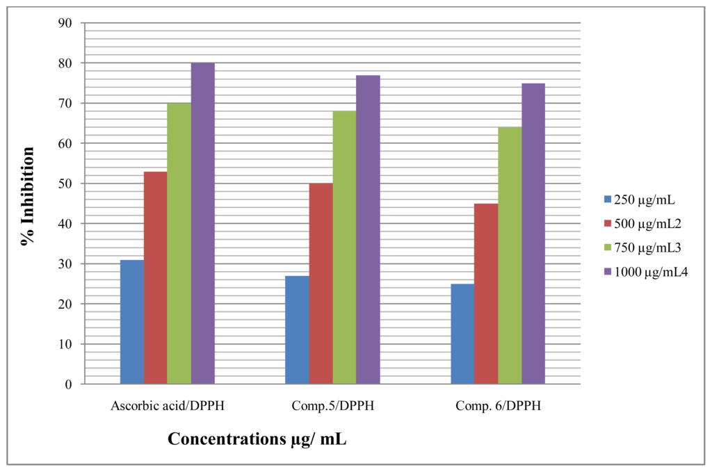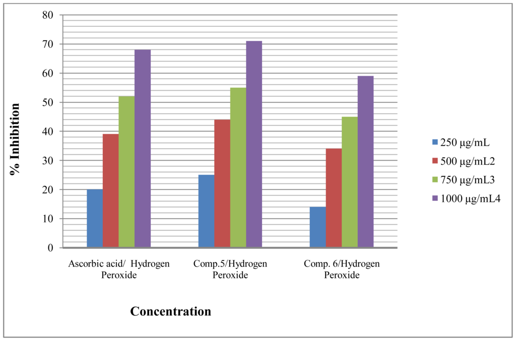 Antioxidant compounds in food play an important role as a health-protecting factor. Scientific evidence suggests that antioxidants reduce the risk for chronic diseases including cancer and heart disease. Primary sources of naturally occurring antioxidants are whole grains, fruits and vegetables. Plant-sourced food antioxidants like vitamin C, vitamin E, carotenes, phenolic acids, phytate and phytoestrogens have been recognized as having the potential to reduce disease risk. Most of the antioxidant compounds in a typical diet are derived from plant sources and belong to various classes of compounds with a wide variety of physical and chemical properties. Some compounds, such as gallates, have strong antioxidant activity, while others, such as the mono-phenols are weak antioxidants [34]. The role of antioxidant is to remove free radicals. One important mechanism through which this is achieved is by donating hydrogen to free radicals in its reduction to non-reactive species. Addition of hydrogen would remove the odd electron feature which is responsible for radical reactivity. Free radicals have been a subject of significant interest among scientists in the past decade. Their broad range of effects in biological systems has drawn the attention of many workers. It has been proven that free radicals play an important role in the pathogenesis of certain diseases and aging. There are many reports that support the use of antioxidant supplementation in reducing the level of oxidative stress and in slowing or preventing the development of complications associated with diseases [35]. Many synthetic antioxidant components have shown toxic and/or mutagenic effects, and there-fore attention has been paid to naturally occurring antioxidants. Compound 5 and 6 were screened for in vitro antioxidant activity using (1,1-diphenyl-2-picrilhydrazyl) DPPH, Nitric oxide and hydrogen peroxide. They show good antioxidant activity against all methods (Figures 2–4). The hydrogen-donating activity, measured using DPPH radicals as hydrogen acceptor, showed that significant association could be found between the concentration of the novel molecule and the percentage of inhibition. Through DPPH test, compounds 5 and 6 have down to reduce the stable radical DPPH to the yellow-colored diphenylpicrylhydrazine. The method was based on the reduction of alcoholic DPPH solution in the presence of a hydrogen-donating antioxidant due to the formation of the non-radical form DPPH-H in the reaction [36]. The nitric oxide assay has been widely used to evaluate the effectiveness of the free radical scavenging on various antioxidant substances. Nitric oxide generated as a result of decomposition of sodium nitroprusside in aqueous medium interacts with oxygen at physiological pH to produce nitrite ions. The nitrite ions were subjected to diazotization followed by azo coupling reaction to yield an azo dye measured by an absorption band at 540 nm. The scavenging ability of the synthesized compounds 5 and 6 was compared with ascorbic acid as a standard. Nitric oxides radical inhibition study showed that the synthesized compounds were a potent scavenger of nitric oxide. The compounds 5 and 6 inhibited nitrite formation by competing with oxygen to react directly with nitric oxide and also to inhibit its synthesis. Scavengers of nitric oxide competed with oxygen, leading to the reduced production of nitric oxide [37].