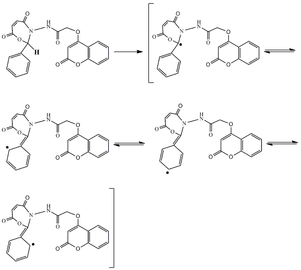 There are two postulated mechanisms for the reaction of compound 5 as an antioxidant as shown in Schemes 3 and 4. The first mechanism depends on the benzyl hydrogen atom (bold hydrogen atom), where this atom was under the influence of two effects, namely resonance and inductive. The resonance effect of benzyl hydrogen makes the release of hydrogen as a free radical easy while the inductive effect on benzene ring, oxygen and nitrogen pushes the electrons toward a carbon free radical, resulting in the molecule becoming stable.