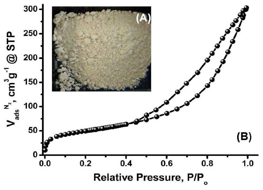 (A) Photograph; and (B) Representative N2 sorption profile of MS/AgNP material (Ag loading: 0.180 mmol g−1).