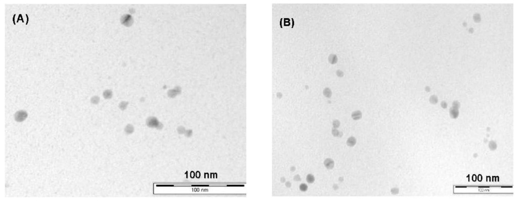 Representative TEM micrographs of MS/AgNP materials; Ag loading (A) 0.059 mmol g−1; and (B) 0.180 mmol g−1.