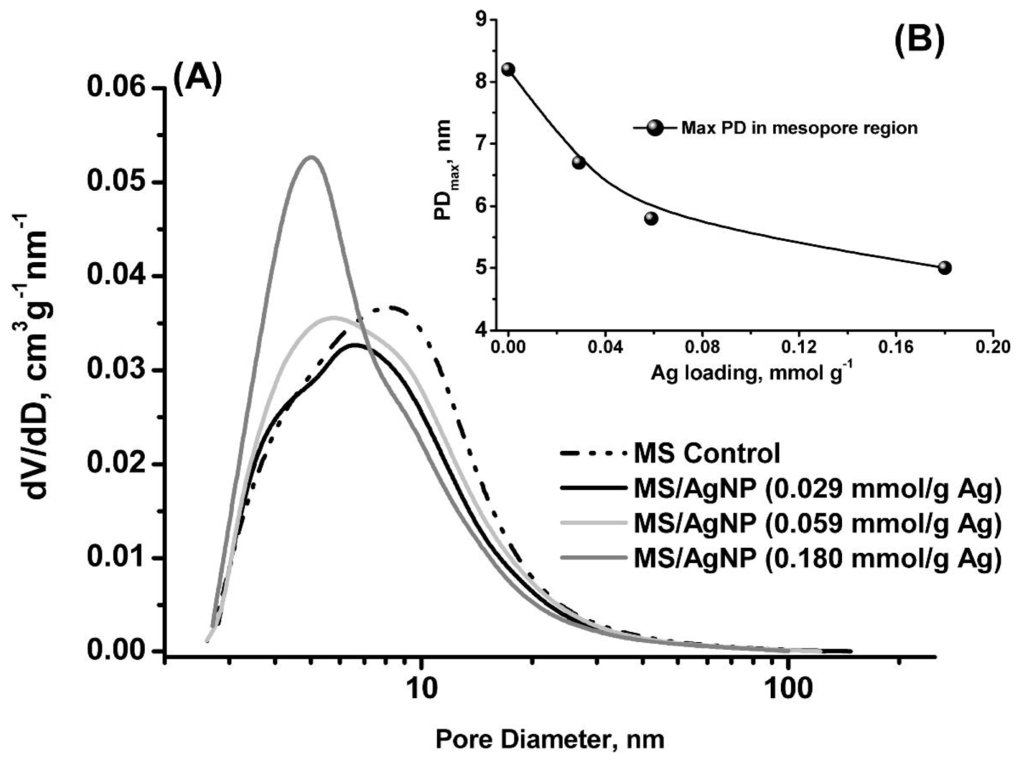 (A) Pore size distributions of MS and MS/AgNP materials prepared at increasing Ag loading; and (B) Relationship between pore diameter maximum in mesopore region and Ag loading.