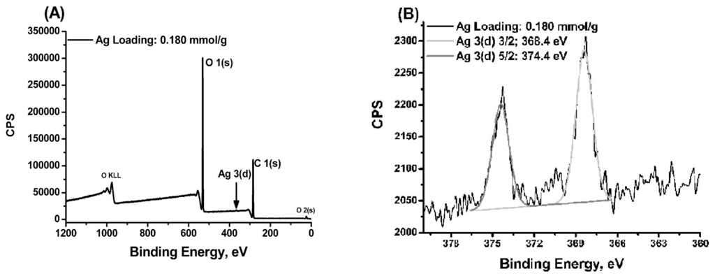 (A) XPS survey scan of MS/AgNP material; and (B) High resolution XPS spectra of the Ag 3 (d) photoelectron envelope (loading: 0.180 mmol g−1).