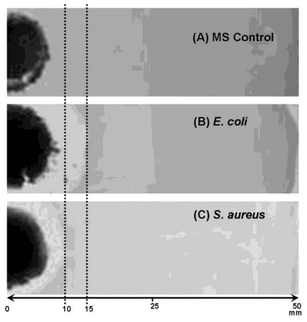 Representative photographs of agar growth plates for (A) S. aureus + MS control experiment; (B) S. aureus + MS/AgNP (0.180 mmol g−1); and (C) E. coli + MS/AgNP (0.180 mmol g−1) (Scale = 50 mm).