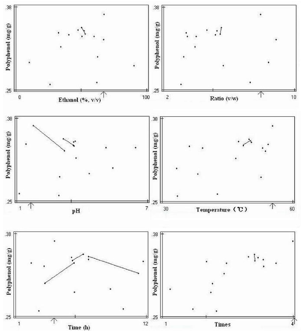 Figure 1). The arrow in each map points to the optimum value of each factor. The similar mapping for optimum extraction conditions of DPPH radical-scavenging activity and extract yield were also obtained (data not shown). The mappings for the pH and heating time factors showed more trend lines toward optimum values, while the mappings for other factors showed less trend lines with undefined directions. These results indicated that the pH and heating time were important factors, which affected greatly extraction process. The final three sets of optimum factor values for three extraction targets were obtained from the mappings (