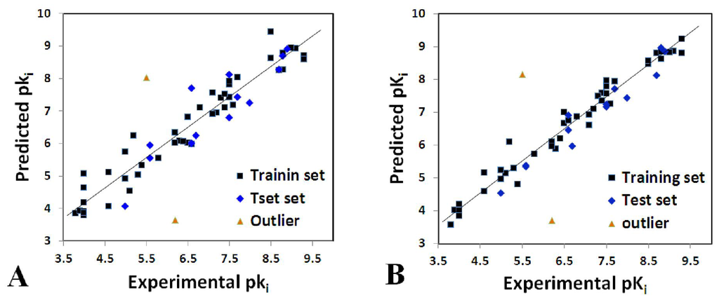 Plot of the predicted pKi versus the experimental pKi values for the models based on the training (filled black squares) and test (filled blue rhombuses) sets. (A) CoMFA, (B) CoMSIA. The solid line is the regression line for the fitted and predicted bioactivities of training compounds. The outliers in test set are shown in orange triangles.