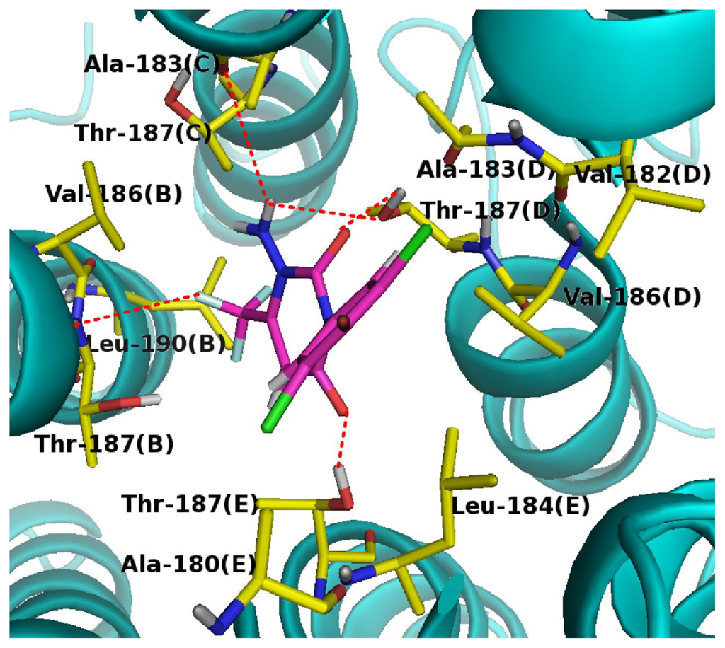 To identify the binding sites of NCAs in GABA-gated chloride channels, some mutagenesis studies show that the amino acids include Ala2 (A2′), Leu3 (L3′), Thr6 (T6′) and Leu9 (L9′) (index numbers for the TM2 region) in the channel lumen are responsible for the interactions of NCAs [,,,]. Correspondingly, as illustrated in our docking model of the complex (Figure 10), the model compound fits into the putative binding pocket lined by five TM2 segments in the channel. The analyses of H-bond interactions in the docking complex indicate that A2′ (Ala-183) and T6′ (Thr-187) (Figures 5 and 10) play key roles in the inhibiting interaction of APDs with housefly GABA receptor, which is consistent with earlier mutagenesis study in the β3 homopentamer that A2′ and T6′ mutations reduce or destroy the NCA radioligand binding []. In addition, A-1′ (Ala-180), 1′V (Val-182), A2′ (Ala-183), L3′ (Leu-184), V5′ (Val-186), T6′ (Thr-187) and L9′ (Leu-190) residues without H-bonding contacts with the compound, are likely to contribute to the APDs’ binding by maintaining the structural integrity of the binding site, or mediating the local conformational movements near the binding site.