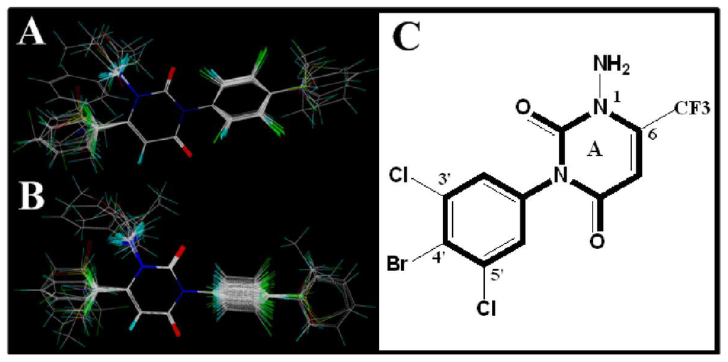 Presently, sixty 3-arylpyrimidin-2,4-diones derivatives acting on housefly GABA-gated chloride channel collected from reference [] were used as dataset with a wide activity ranging from 3.8 to 9.3 (pKi values), which was then divided into a training set and a test set in a ratio of 3:1 based on adequate coverage in terms of both the inhibitory activity and the structural diversity. The training set was used to construct 3D-QSAR models and the test set (asterisked molecules in Table 1) was used for the model validation. Table 2 shows the structures and biological data (pKi) of all compounds.