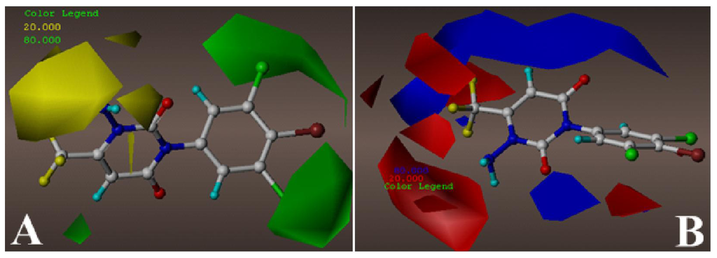 Stdev*coeff (A) steric, (B) electrostatic contour maps of ligand-based optimal CoMFA model. The color code is as follows: (A) green and yellow contours indicate favorable and unfavorable bulky groups, respectively; (B) blue and red contours indicate favorable and unfavorable electropositive groups, respectively. The compound 58 in ball and stick is displayed as a reference. (Yellow atom: fluorine; red: oxygen; blue: nitrogen; green: chlorine; brown: bromine).