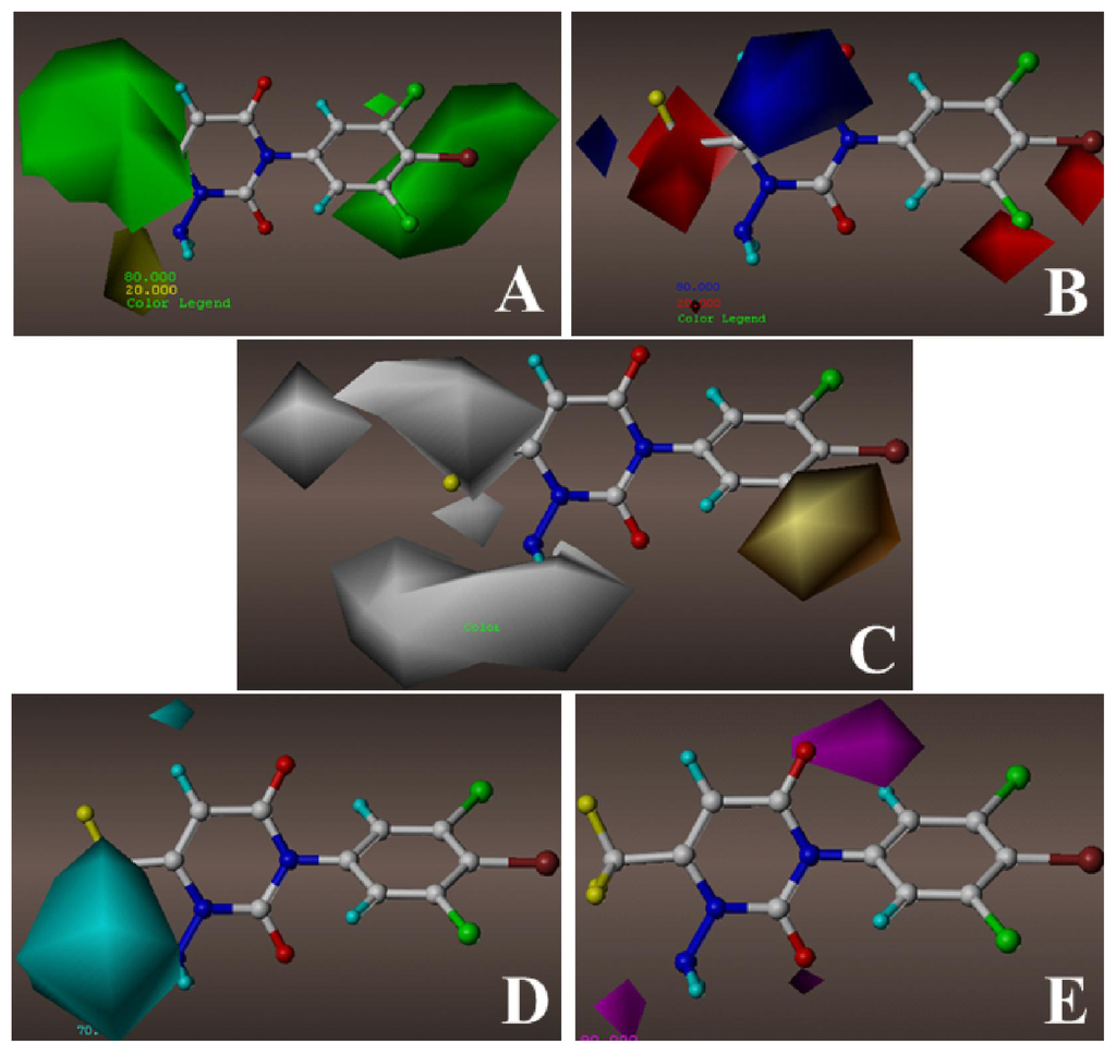 stdev*coeff (A) steric, (B) electrostatic, (C) Hydrophobic, (D) H-bond donor and (E) H-bond acceptor contour maps of ligand-based optimal CoMSIA model. The color code is as follows: (A) green and yellow contours indicate favorable and unfavorable bulky groups, respectively; (B) blue and red contours indicate favorable and unfavorable electropositive groups, respectively; (C) orange and white contours indicate favorable and unfavorable hydrophobic groups, respectively; (D) cyan contours indicate favorable H-bond donor groups; (E) magenta contours indicate favorable H-bond acceptor groups. The compound 58 in ball and stick is displayed as a reference. (Yellow atom: fluorine; red: oxygen; blue: nitrogen; green: chlorine; brown: bromine)
