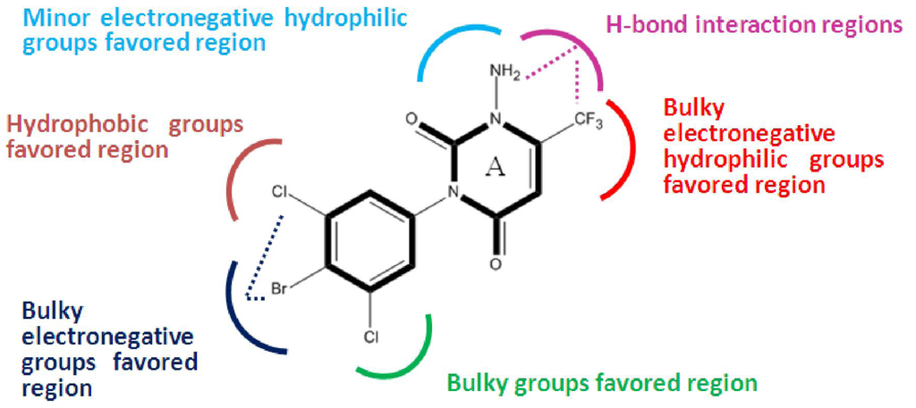 The CoMSIA contour maps of the hydrogen-bond donor and acceptor fields are shown in Figures 3D and 3E, respectively. In Figure 3D, a large cyan contour appears enclosing the amino substituent of ring A, which suggests that the amino group acts as an H-bond donor by forming H-bond with the residue of the binding site. The cyan contour implies that an optimum H-bond donor group is expected to increase the activity, which agrees well with the fact that compounds 50–60 with the amino group at the N-1 show significantly increased potency compared to the analogous compounds 7 and 13–21. In the H-bond acceptor contour map, two magenta contours near two ketone groups of ring A indicate the importance of H-bond acceptor group for the binding activity. In addition, the presence of another magenta contour near 6-position of ring A reveals the extreme importance of the -CF3 group in 6-position.