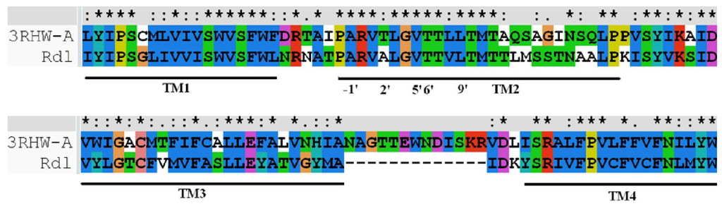 Alignments of the sequences of the TM domains between the Rdl subunit of housefly GABA receptor and the 3RHW chain A template. Different types of amino acids are depicted in different colors. The four transmembrane domains (TMDs) of Rdl subunit are indicated with bold lines and the positions of the 2′, 6′ and 9′ residues in TM2 of Rdl subunit are also indicated. “*”, identical residues; “:”, conserved substitutions; “.”, semi-conserved substitutions.