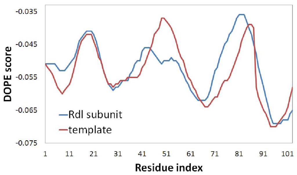 Discrete optimized potential energy (DOPE) score profiles of the template and modeled Rdl subunit.
