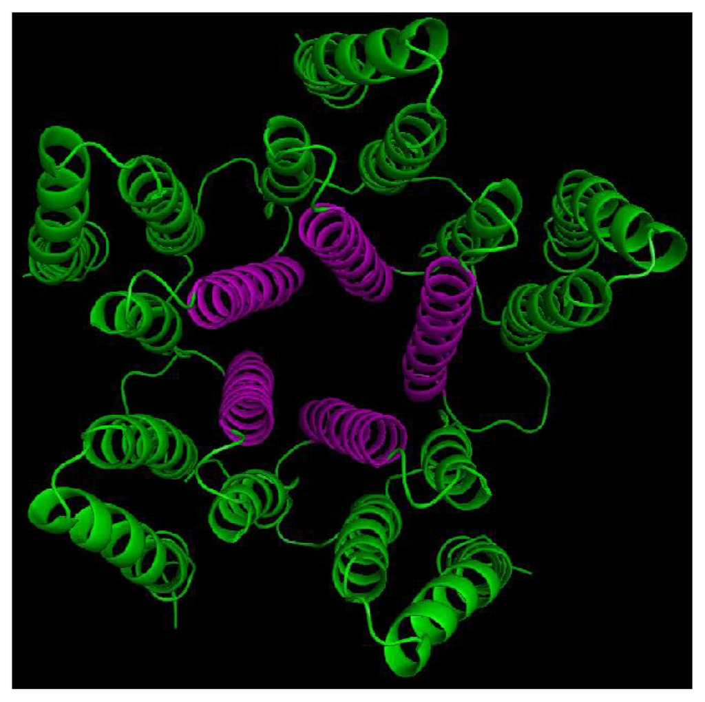 The final refined TM domains of the housefly GABA receptor shown in cartoon representation. Green: TM1, TM3, TM4; magenta: TM2.