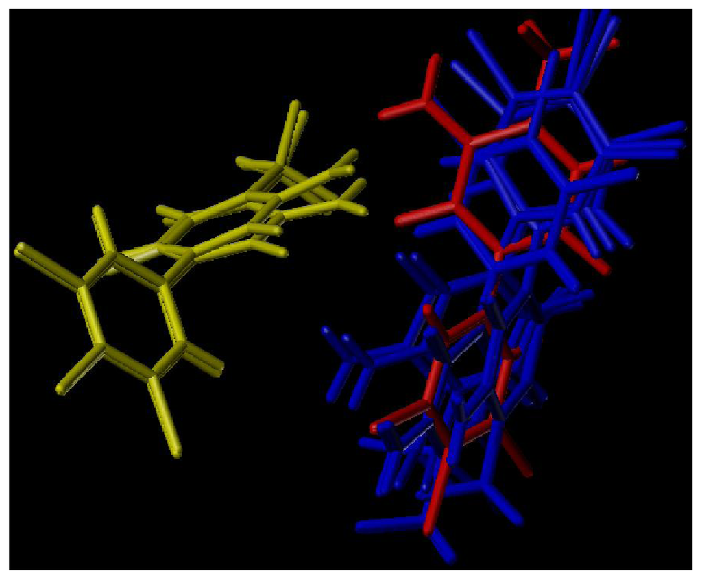 The structural conformations of the top 10 scored poses. Blue: orientation I; red: orientation II; yellow: orientation III.