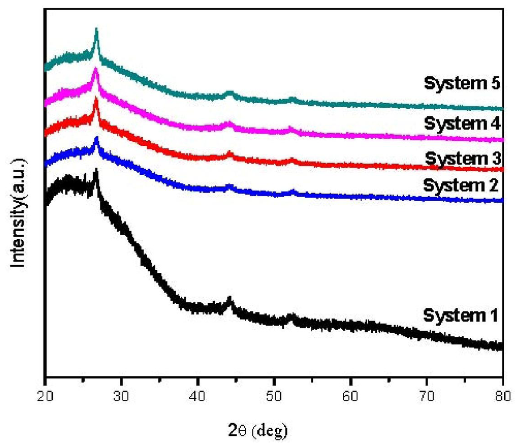 Study of the morphology of films deposited by CBD showed they are polycrystalline nature (Figure 1). System 1 (undoped) shows peaks at 2θ = 26.5887, 30.9108, 44.1861, 52.2420 and 54.4284 (ref: 01-080-0019), which belong to (111), (200), (220), (311) and (222) of cubic CdS phase, respectively. These peaks also appeared in all doped film which indicates that Sn doping did not change the cubic CdS lattice structure. Films with lower Sn doping exhibited strong preferential orientation of (111) plane. The corresponding peak intensities from (111) plane increased with increasing Sn doping, which indicates that Sn atoms of slightly bigger radius are inserted at the smaller S atoms in the cubic lattice. Hence, the Sn ions substitute S in lattice positions in good order instead of filling the free spaces. Therefore, very low concentration of Sn dopants did not change the crystal structure of CdS; however, other peaks related to Sn compounds, mostly the SnS with orthorhombic structure, appeared in all doped films. Increasing Sn doping of CdS was accompanied by decrease in d spacing (see Table 2), indicating smaller cubic structure. The d values are in agreement with JCPDS standard. In the presence of low Sn doping also, the films produced a few additional small peaks at 2θ = 23.2035, 60.867 and 52.716 (ref: 01-079-2193) that belong to (111), (314) and (132) related to SnS with orthorhombic phase. These peaks did not show significant change in agreement with previous works [12,14].