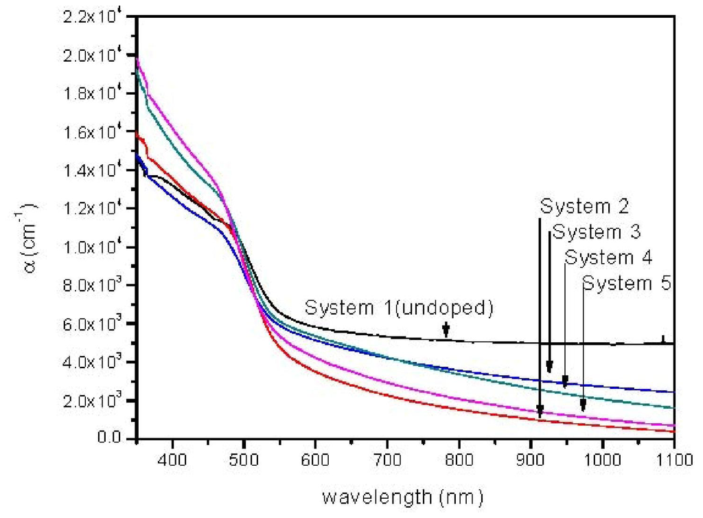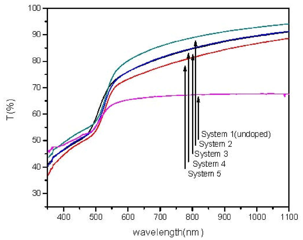 The UV-Vis transmission spectra of all the Sn-doped films exhibited sharp fall at the band edge, which suggests good crystallinity of the thin films (Figure 2). Films doped with Sn showed a sudden increase in transmittance because they are thicker and there is more space inside the lattices in doped films. However, in System 3 onwards, the transmittance spectra showed less transparency with increasing dopant, which agrees well with the earlier report on Copper doping [11]. This may be attributed to more scattering of photons by the introduction of dopant as foreign atoms, which may reduce transmittance. Compared with the constant value of 65% transmittance of undoped film before band edge, the doped films have about 90% transmittance of Incident Solar Spectrum around 1100 nm wavelength region and fall to a minimum of 73% before band edge. This is about a 20% improvement in transparency for the low Sn doped film.