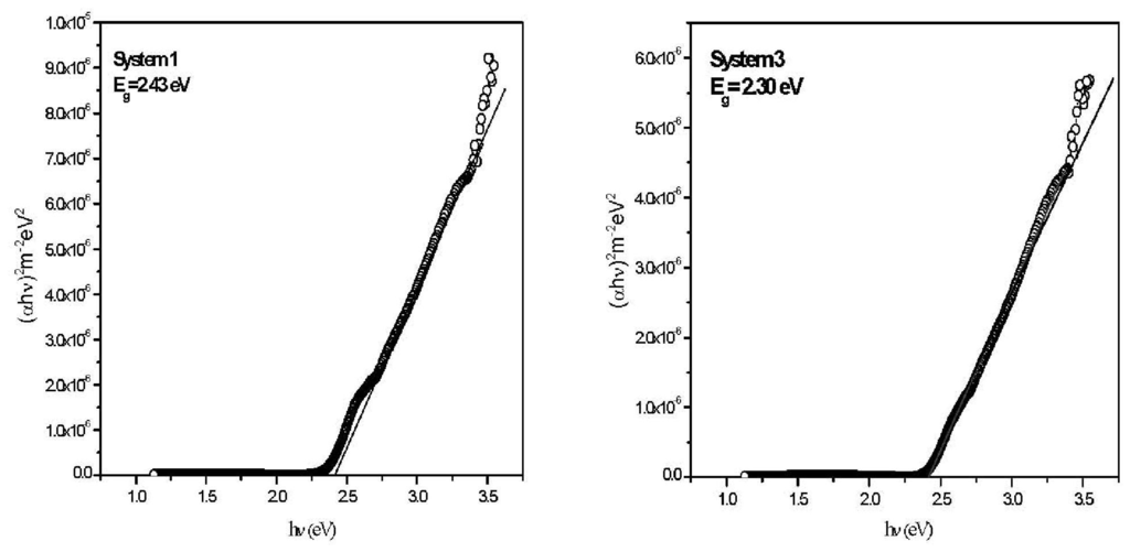 A typical plot of (αhυ)2 versus photon energy for Systems 1 (left panel) and 3 (right).