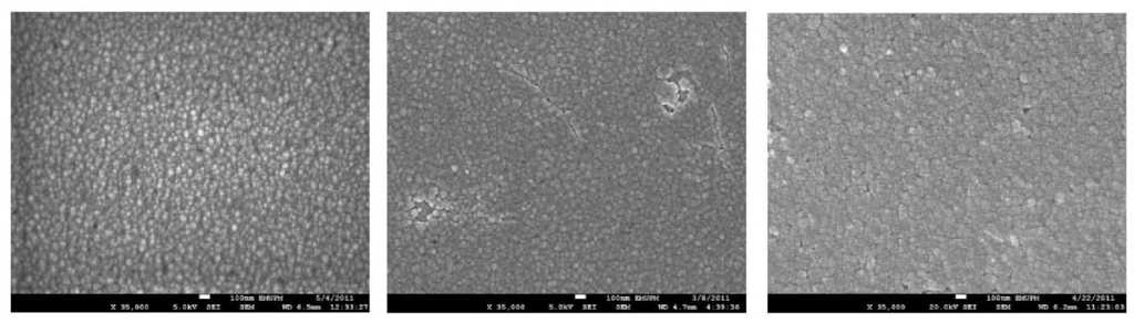 FE-SEM images of CdS films corresponding to System 1 (undoped; left panel), System 2 (middle panel), and System 5 (right).