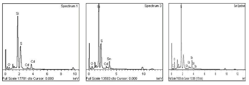 Figure 6 presents FE-SEM micrographs of the film surfaces of System 1, 2 and 5. These images reveal that the films are compact, free of colloidal particles and are in good order. The sizes of grains were in the same range as those that show homogenous distribution of Sn dopant in films. Increasing the dopant led to grain growth. Both the doped films are more compact compared with the undoped film. During the growth of films, the nuclei appeared and grew as discrete surface grain. The surface grain size became larger, with less void area, and led to the formation of high quality film surfaces. The EDAX analysis of the undoped and two doped systems is shown in Figure 7. For undoped film, the maximum amount of Cd and S observed were 31.04% and 10.08%, respectively. For System 2 and 5, the quantities of Cd decreased, S remained almost constant, and Sn increased from (10.09:3.68:6.20) to (9.06:3.0:9.06). In both the systems, at low dopant concentration, the Sn atoms substitute Cd atoms in the lattice. Other systems, such as 3 and 4, showed variations intermediate to Systems 2 and 5.