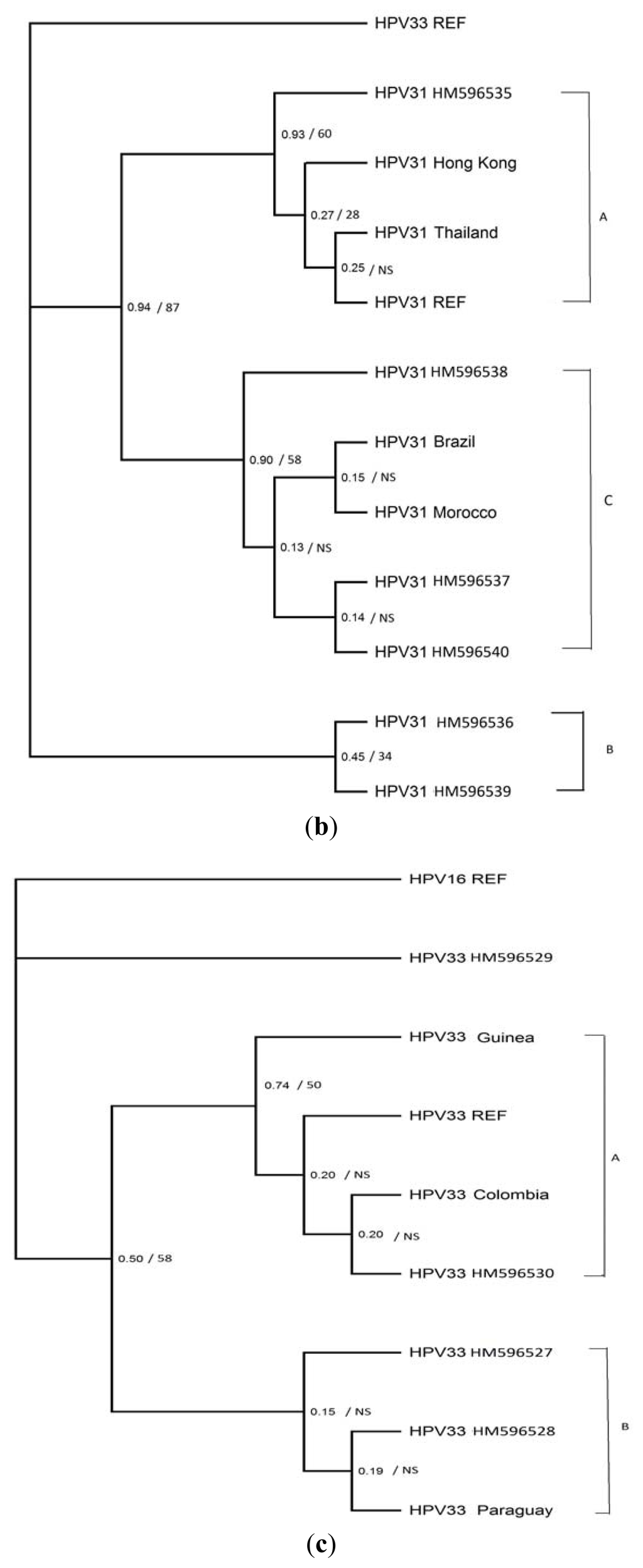 Bayesian inference (BI) tree (50% majority rule consensus tree) based on sequences of L1 (MY9/11) gene for HPV types. Numbers at nodes indicate posterior probabilities and bootstrap support in the BI and maximum parsimony (MP) analyses, respectively (BI/MP). NS denotes nodes that are not supported. (a) Tree of variants of HPV16 found in this study, along with HPV reference sequence and variants of HPV 16 retrieved from GenBank: HPV 16 EG (European German, AF536179), HPV 16 AA (Asian American, AF402678), HPV 16 Af2 (African type 2, AF472509), HPV 16 Af1 (African type 1, AF536180). In the tree of HPV 31 (b) some variants of HPV 31 have been submitted previously [10] to GenBank database: HPV 31 Hong Kong (DQ057327), HPV 31 Thailand (DQ057331), HPV 31 Brazil (DQ057330), and HPV 31 Morocco (DQ057332). In the tree of HPV 33 (c) variants of HPV 33 have been submitted previously by Stewart et al. 1996 [11] to GenBank database: HPV 33 Guinea (U45897), HPV 33 Colombia (U45895), HPV 33 Paraguay (U45896). In the tree of HPV 18 (d) variants of HPV 18 have been submitted previously by Stewart et al. [11] and Chen et al. [6] to GenBank database: HPV 18 Uganda (U45893), HPV 18 Benin (U45894, U45892), HPV 18 Poland (U45891), HPV 18 Argentina (U45889), HPV 18 Chile (U45890), HPV 18 Af2 (African type 2, Qv17199), HPV 18 Af1 (African type 1, Qv21444), HPV 18 E1 AA (European Asian American, Qv03132, Qv16302), HPV 18 E2 (European, Qv21751). In the tree of HPV 45 (e) variants of HPV 45 have been submitted previously to GenBank database: HPV 45 Guinea (U45910, U45906), HPV 45 Canada (U45911), HPV 45 Chile (U45908, U45912), HPV 45 Colombia (U45909), HPV 45 Argentina (U45907), HPV 45 Indonesia (U45913), HPV 45 Uganda (U45916, U45915), and HPV 45 Tanzania (U45910).