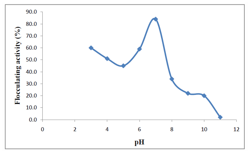 The pH of the solution is also a key factor in flocculation and thus effectively influences the flocculation process [26]. The effect of initial pH of the medium on flocculating activity by Arthrobacter sp. Raats was investigated at pH values ranging from 3 to 11, and the flocculating activity was found to be distinctly higher (84%) in neutral pH conditions (pH 7.0) than in acidic and alkaline conditions (Figure 2). Similar pH values (pH 7.2 and 7.0) were reported for optimum activity of bioflocculants ERSS-31 produced by Halomonas maura sp. nov. [27] and MBFW31 produced by Vagococcus sp. W31 [22] respectively. Bioflocculant HBF-3, produced by a mutant Halomonas sp. V3a’ also attained the highest flocculating activity at pH 7 [23]. At low pH, the absorption of H+ ions tends to weaken the bioflocculant-kaolin complex formation process and a similar effect is also observed at high pH values due to OH− ions [23]. According to Li et al. [25], the mediating effect of cations appears to be strongest at neutral pH values. However, these observations are different from studies carried out by Choi et al. [28] and Zheng et al. [2] in which the maximum flocculating activities of bioflocculants produced by Anabaena sp. and Bacillus sp. F19 respectively were observed at pH 2. The bioflocculant produced by Bacillus sp. PY-90 was found to be actively high in an acidic pH range of 3.0 to 5.0 [29], while Serratia ficaria produced a bioflocculant effective over a weakly acidic pH range of 5.0 to 7.0 [20].